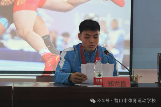 二、初心不改,感恩与担当同行 座谈结束后,郑世昌便走进了早已坐满师生的大会议室。他刚一跨进门,台下就响起了热烈的掌声。发言过程中,郑世昌提及自己的启蒙教练朱振刚,言语间满是感恩:“2013年,是朱教练带我正式踏入摔跤运动的大门。初学阶段的训练强度远超想象,好几次累到想放弃时,都是他留在训练馆陪我加练,反复叮嘱我再坚持一下,就有希望。印象最深的是一次决赛,我眼角意外受伤,视线模糊到几乎看不清对手,正是这句话支撑着我咬紧牙关,放手一搏完成了比赛。”